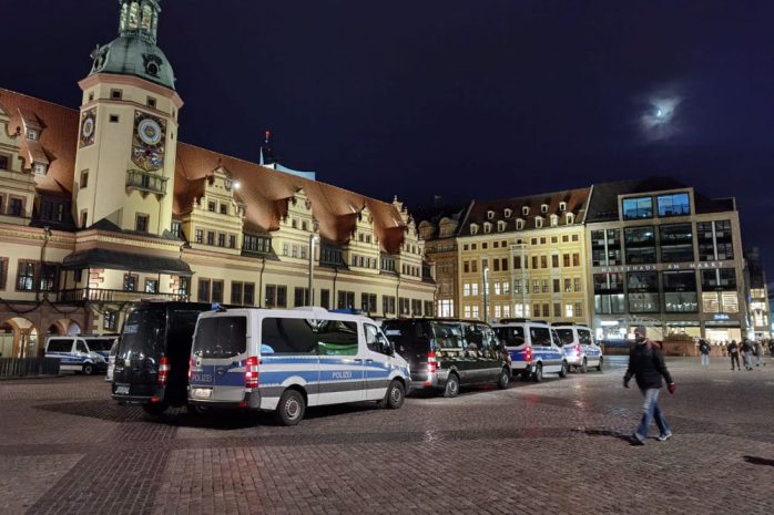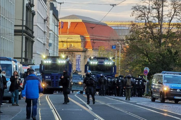 Nach einem Aufzug auf dem Innenstadtring sieht es bislang nicht aus. Die Polizei ist rund um Augustusplatz und Wilhelm-Leuschner-Platz mit schwerem Gerät präsent. Allerdings wollen die Pandemie-Leugner/-innen erst gegen 15:30 Uhr auf den Ring. Bis dahin könnte sich die Lage also noch ändern.