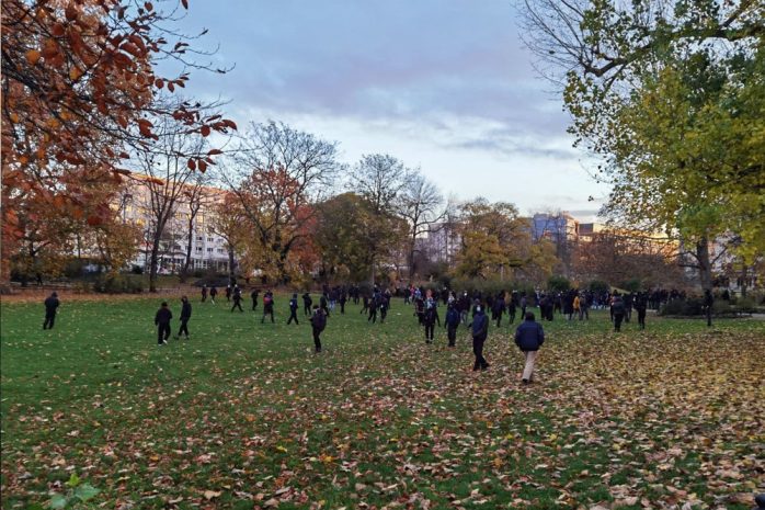 Die Polizei hat in der Großen Fleischergasse soeben die Durchsage gemacht, dass sich die ersten 30 Personen entfernen dürfen. Die Menge reagiert mit: „Wir gehen zusammen“-Rufen. Eine Person macht eine Durchsage, dass man sich nicht voneinander trennen lassen soll, weil die Antifa sonst leichtes Spiel hätte. Vorschlag unsererseits: Maske aufsetzen; dann fällt man auch nicht negativ auf.
