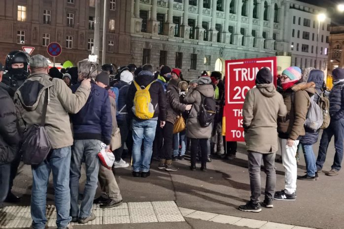 In der ersten Reihe sind übrigens mehrere Protagonist/-innen de rechtsradikalen Medienszene zu sehen. Einer von ihnen – der sogenannte Volkslehrer – wurde abgeführt. Seinen falschen Presseausweis ist er los.
