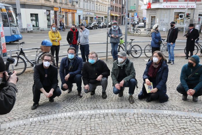 Es gibt Worte die bleiben. So klar und eindeutig, dass sich Generationen später entscheiden, sie tatsächlich in Steine zu schlagen, sichtbar für jene, die in den kommenden Jahren diese Stelle kreuzen. Seit dem heutigen 5. März 2021 prangen anlässlich des 150. Geburtstages von Rosa Luxemburg auf dem Boden vor dem Eingang des traditionsreichen Plagwitzer Felsenkellers jene Worte, welche sie drinnen im Jahre 1913 vor vollem Haus sprach: „Solange das Kapital herrscht, werden Rüstungen und Kriege nicht aufhören.“