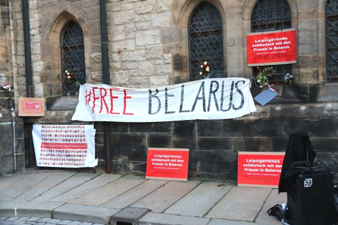 Doch so standen am Ende kurz nach 19 Uhr 20 Menschen vor dem Haupteingang der Nikolaikirche. Ihnen gegenüber eine sich langsam sammelnde Menge von am Ende rund 100 Gegendemonstranten und Besucherinnen der „Belarus“-Solidaritäts-Demo, welche bereits seit 18 Uhr an fast gleicher Stelle lief.