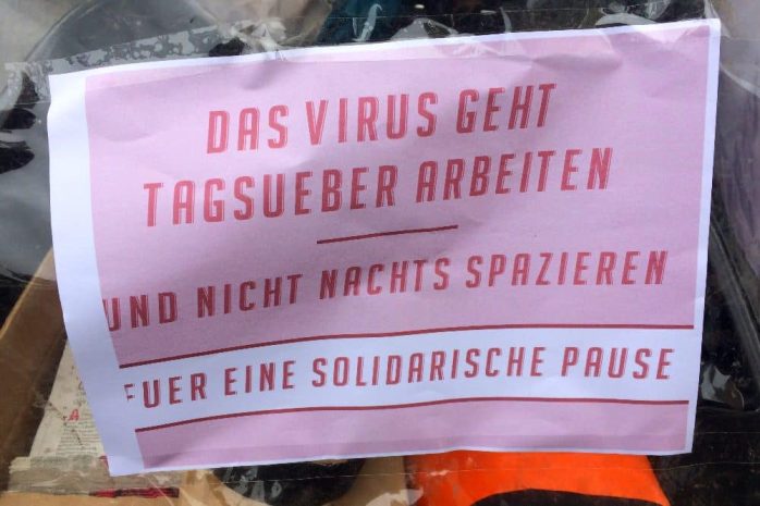 Die „Naturfreundejugend“, „Prisma“ und das „Medinetz“ hatten einen gemeinsamen Fahrradaufzug vom Rabet im Osten zum Clara-Zetkin-Park im Western organisiert. Redebeiträge gab es dort unter anderem auch von der Leipziger „Seebrücke“. Im Mittelpunkt stand die Forderung nach einer „solidarischen Pause“, also einem Shutdown, der nicht nur das Private, sondern auch große Teile der Wirtschaft in den Blick nimmt. Mehrere hundert Personen beteiligten sich.