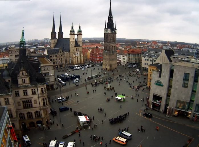 Nachdem die Kundgebung auch in Halle verboten worden war, sammelte sich die auch aus Leipzig herangefahrene Polizei bis etwa 16:40 Uhr rings um den Markt, um kurz darauf in Gruppen denselben systematisch zu räumen. Friedlich und schnell, während im Hintergrund vier Wasserwerfer und zwei Räumpanzer aufgefahren waren – gegen 17 Uhr war der Platz dann praktisch wieder leer.