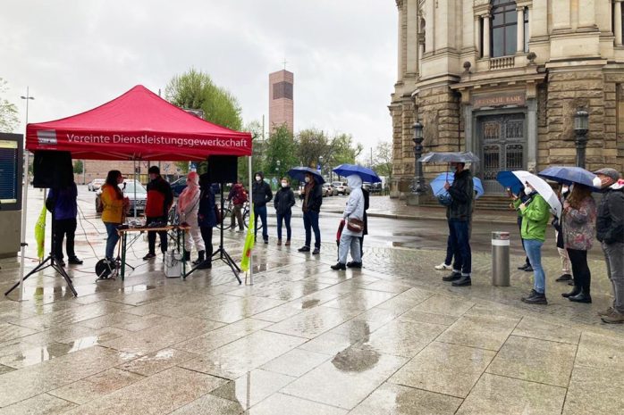 Vom Uniklinikum ging es weiter zum kleinen Wilhelm-Leuschner-Platz. Um 16.30 Uhr hatten dort der Stadtverband der Leipziger Linken, der SDS Leipzig und die Gewerkschaft ver.di zu einer Kundgebung eingeladen. Etwa 150 Menschen trotzten dem Regen, versammelten sich am Nachmittag in der Innenstadt und zeigten sich auch während eines zehnminütigen Technikausfalls von der geduldigen Seite.