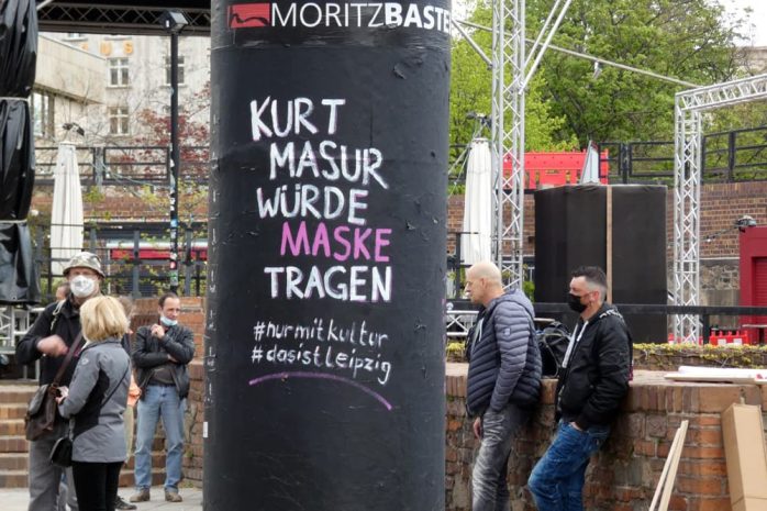 Am vergangenen Montag hatten sich die Organisatoren der „Bürgerbewegung Leipzig 2021“ in bekannter Pegida-Rhetorik gewünscht, dass beim nächsten Mal jeder noch eine Person mitbringt. Heute ist aber eher das Gegenteil der Fall. Statt die Zahl der Teilnehmer/-innen zu verdoppeln – rund 200 wurden erwartet – sind es nur ein paar dutzend, die auf dem Kurt-Masur-Platz stehen. Das ist circa ein Drittel der Teilnehmer/-innen vom vergangenen Montag.