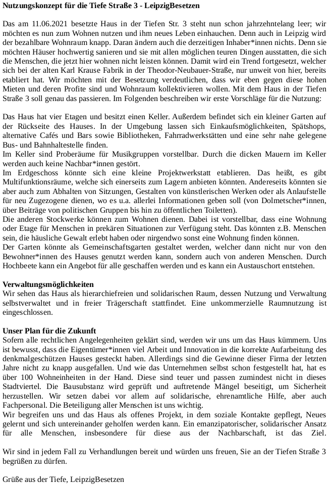 Ein längeres Statement der Besetzer der Tiefe Straße 3