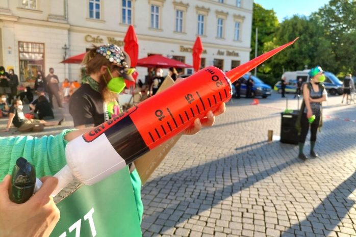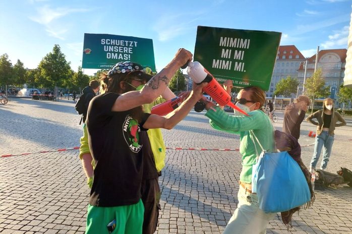 Bis es so weit ist, sehen wir uns aber hier noch die Redebeiträge und Impressionen vom zahlenmäßig etwa gleich starken Gegenprotest vom heutigen 31. Mai 2021 an. Dieser war mit übergroßen Spritzen, Schildern mit Sprüchen wie „Mimimi“ angetreten und zeigte seine Solidarität mit der Reptiloidenregierung mittels entsprechender Masken und Verkleidungen.