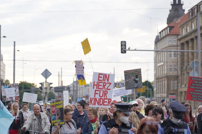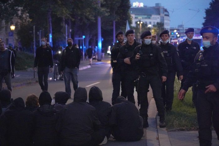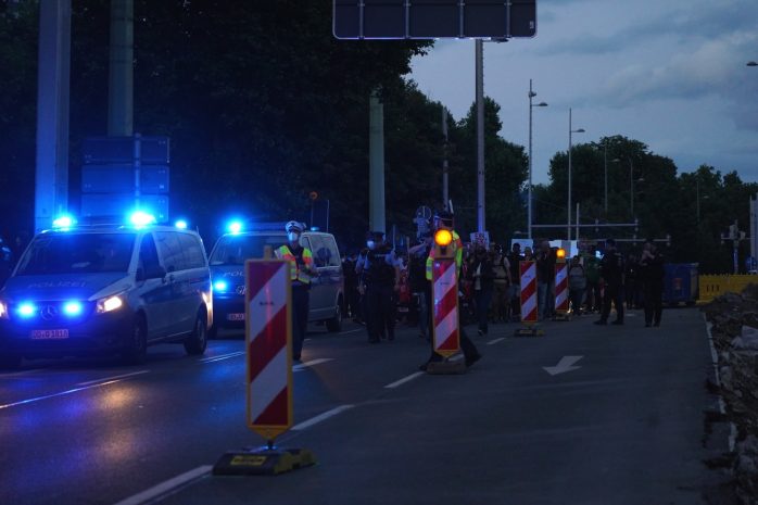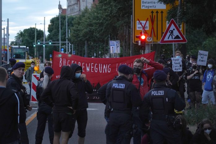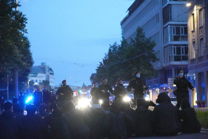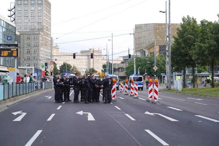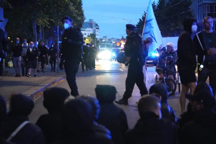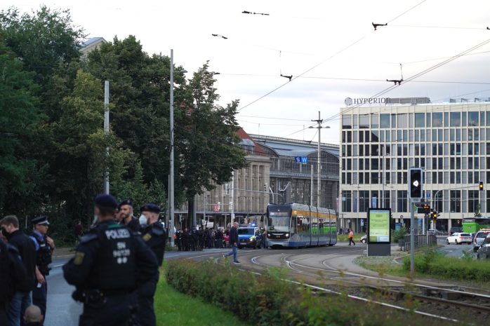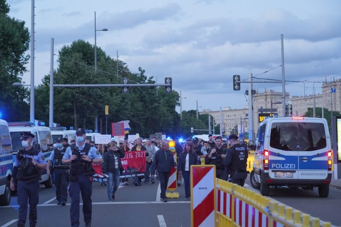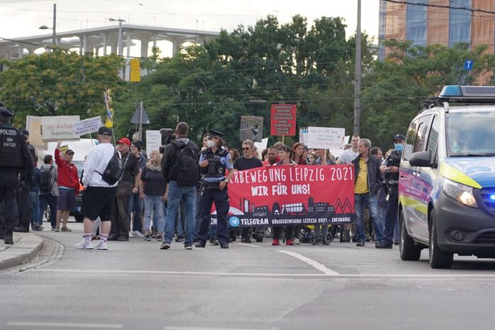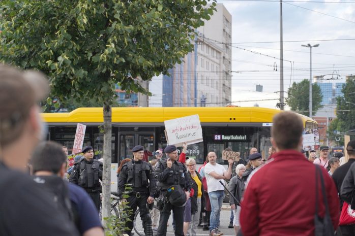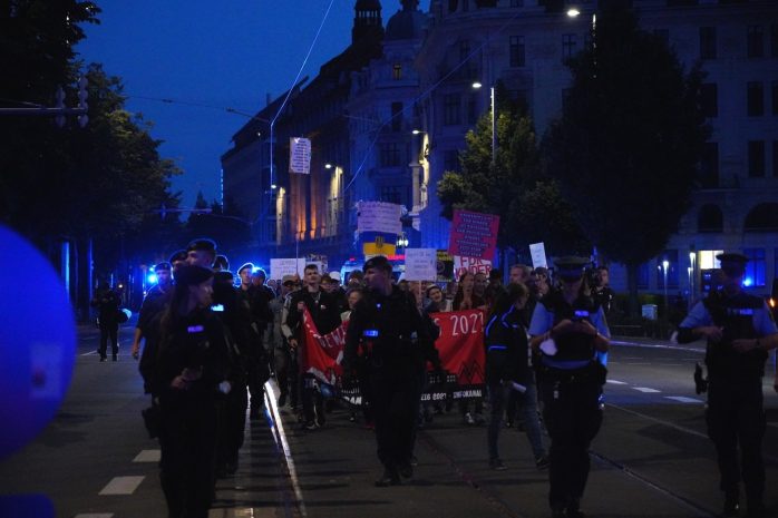 Wenn linke Gruppen zum Protest gegen die verschwörungsideologische „Bürgerbewegung Leipzig 2021“ aufrufen, nutzen sie häufig Schlagworte wie „Legida 2.0“. Das zielt zum einen auf Inhalte und Publikum und zum anderen auf die ritualisierten „Ringspaziergänge“ am Montagabend mit einer überschaubaren, stets sehr identischen Teilnehmerschaft. Auch an diesem Montagabend, dem 2. August, waren es wieder rund 75 Personen, die stundenlang unterwegs waren – immer wieder aufgehalten durch antifaschistische Sitzblockaden.