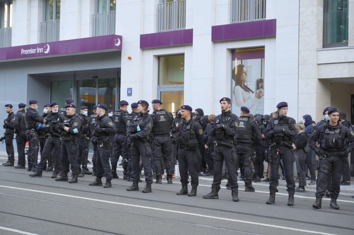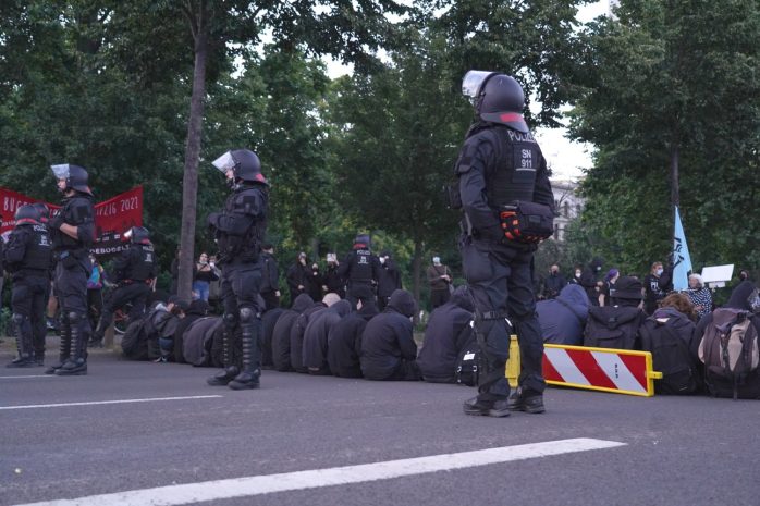 Nach ersten Zeugenberichten vor Ort wurde die Ingewahrsamnahme in der Nähe des Bankeinganges mit mindestens zwei Tritten der Beamt/-innen gegen die Person begleitet. Zwar gehörte der kurzzeitig Festgesetzte zum Gegenprotest, doch was ihm genau vorgeworfen wurde, war vor Ort nicht zu ermitteln.