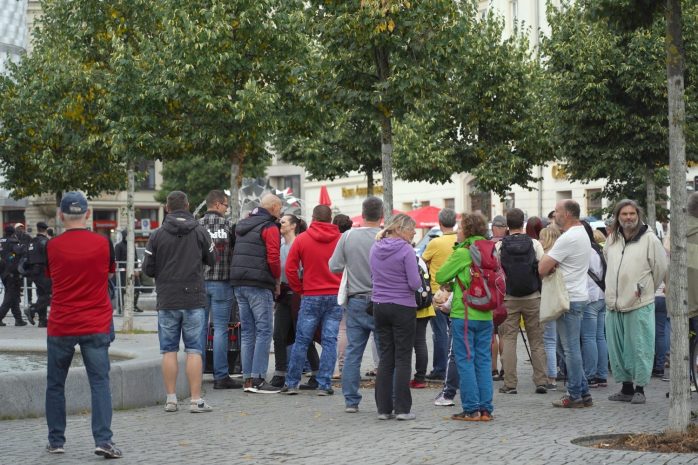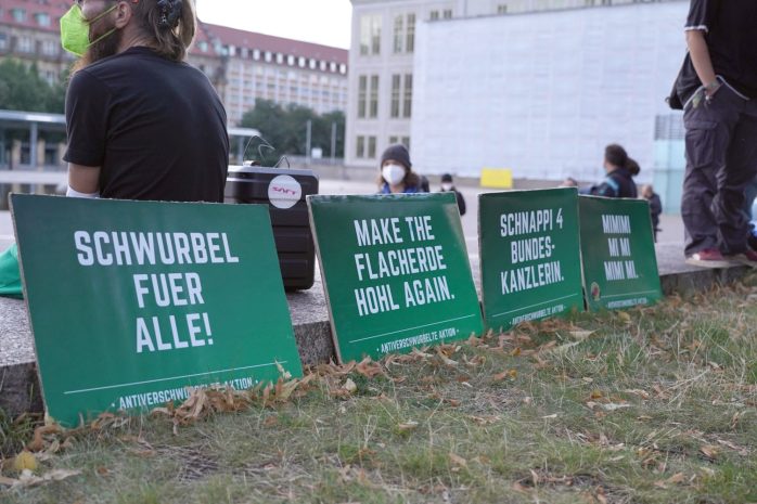 Auftritte von AfD-Politiker/-innen bestätigten, wie auch die langjährige führende NPD-Mitgliedschaft des ständigen Versammlungsanmelders Volker Beiser. Heute waren die „gemäßigten“ Pandemie-Leugner/-innen trotzdem da.Auch das halbe Dutzend, das am Samstag, 31. Juli 2021, aus einer etwa 50 Personen starken Neonazi-Gruppe heraus gegen die Antifa-Demo in Zwönitz gepöbelt hatte, war wieder anwesend. Die Gruppe, die aus etwa sechs Personen besteht, ist unter anderem daran zu erkennen, dass sich einige daraus mit „Fuck Nazis“-Rucksäcken zeigen. Es ist zu vermuten, dass „Fuck“ in diesem Fall wörtlich zu nehmen ist.