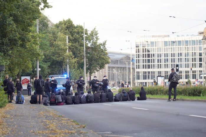 Bereits am Hauptbahnhof bildeten etwa 15 Personen aus dem Gegenprotest an der Strecke heraus eine Sitzblockade. Nach einigen Minuten löste sich diese freiwillig auf. Einige hundert Meter weiter in der Nähe der Oper folgte die nächste Sitzblockade mit ähnlicher Personenzahl. Auch diese war nach einigen Minuten vorbei. Am Wilhelm-Leuschner-Platz wiederholte sich das Vorgehen.