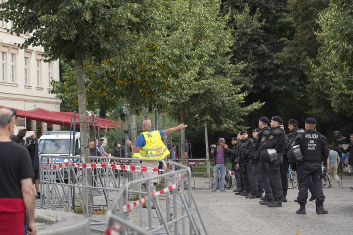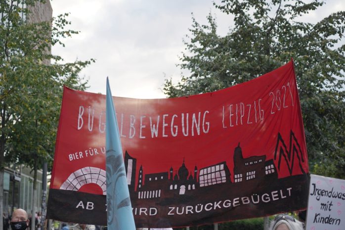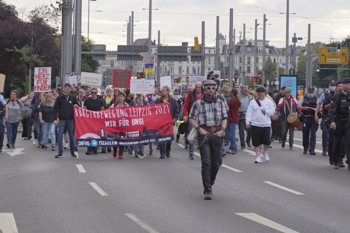 Zum Auftakt gab es wie gewohnt eine Kundgebung auf dem Richard-Wagner-Platz, wo Organisator Volker Beiser dieses Mal fehlte. Dafür waren Führungsfiguren der zu „Querdenken“ gehörenden „Bewegung Leipzig“ anwesend. Diese „konkurrierende“ Gruppe hatte eigentlich schon vor Monaten erkannt, dass die „Bürgerbewegung“ rechtsradikal ist.