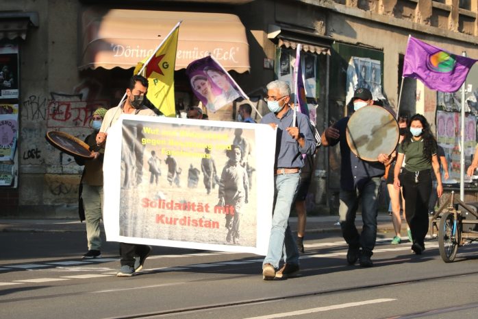 Das Rojava Solibündnis Leipzig dazu: „Am Montag sorgte der erste Luftschlag für zwei Tote, die Bombardierung eines Krankenhauses am Dienstag ermordete 8 weitere Menschen. Das Gebiet Şengal ist das Hauptsiedlungsgebiet der Êzîd/-innen, eine Gemeinschaft, die 2014 den 73. Genozid erfahren haben. Der Jahrestag ist gerade erst gewesen: der 3. August. Doch dieser Genozid kann nicht als beendet betrachtet werden bis Frieden herrscht.“