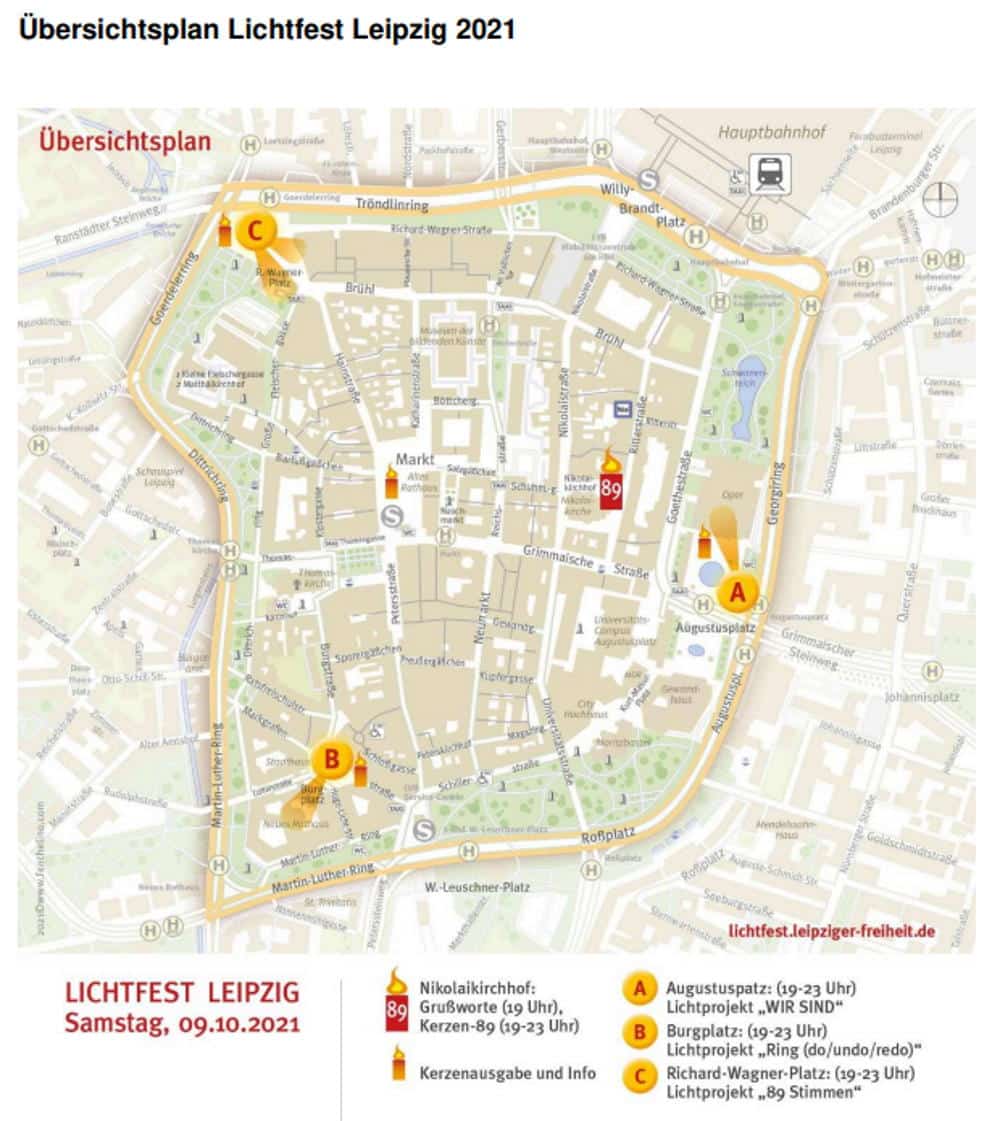 Wichtigste Änderung gegenüber den Vorjahren dabei ist: Statt wie bislang ausschließlich auf dem Augustusplatz ist das Lichtfest in diesem Jahr an mehreren Orten innerhalb des Rings zu Gast, an denen von 19 bis 23 Uhr Lichtinstallationen zu erleben sind. Neu ist ebenfalls, dass es kein Bühnenprogramm gibt und damit auch kein dichtes Gedränge auf dem Augustusplatz.Besucherinnen und Besucher können so den ganzen Abend nutzen, um alle Installationen und die Kerzen-89 in loser Reihenfolge aufzusuchen. Die Kerzen-89, die traditionell von den Besuchern zum Leuchten gebracht wird, steht diesmal auf dem Nikolaikirchhof. Dort gibt es um 19 Uhr auch kurze Grußworte mit musikalischer Umrahmung. Wie schon im Vorjahr können die Leipzigerinnen und Leipziger im Vorfeld des Lichtfestes wieder symbolisch Kerzenpatenschaften übernehmen.