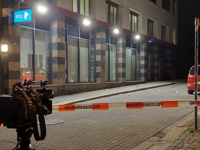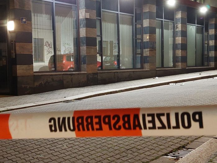 Polizeikräfte suchen noch das Gebiet um die Wiedebachpassage auf der Biedermannstraße ab. Das Straßenstück an der Polizeistation ist mit Flatterband abgesperrt.