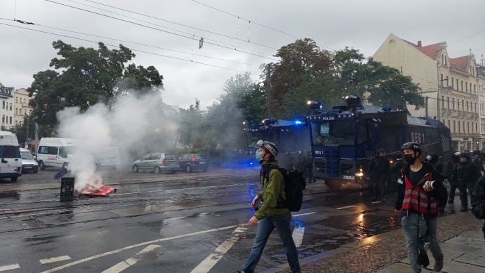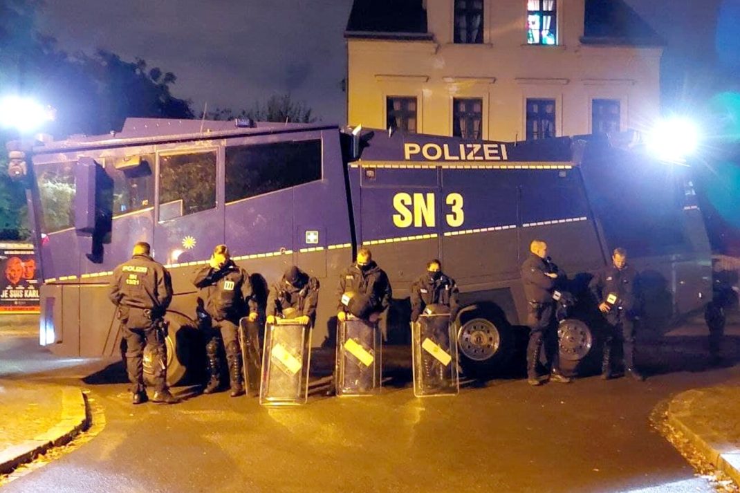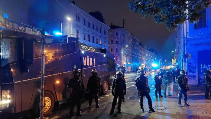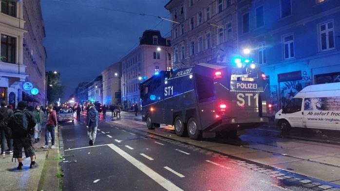 Die Polizei hat ihre Zurückhaltung aufgegeben und mit Wasserwerfern und einem massiven Polizeieinsatz das Connewitzer Kreuz geräumt, die Lage beruhigt sich vorerst wieder etwas. Erste Personen wurden in Gewahrsam genommen. Hinzu kommt der einsetzende Regen in Leipzig, der zumindest das Anzünden von weiteren Barrikaden deutlich erschwert. Bei den Beamten wurde auch der Einsatz von Tränengas freigegeben.