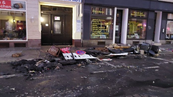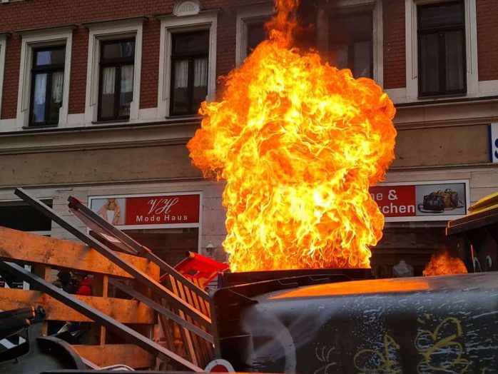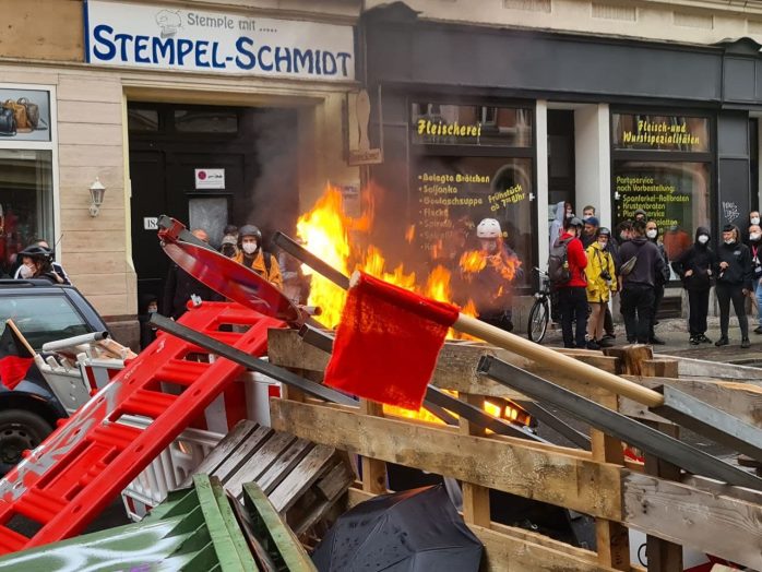 In der Wolfgang-Heinze-Straße brennt mindestens eine größere Barrikade, aktuell verlegt sich das Geschehen Richtung Herderpark. Weitere Barrikaden sollen im Bau sein, es gibt erste Steinwürfe auf Polizeibeamte. Damit dürfte die Friedlichkeit und die Demo selbst abschließend vorbei sein, weshalb sie auch um 17:55 Uhr beendet wurde – es geht ab hier einigen nur noch um Gewalt.