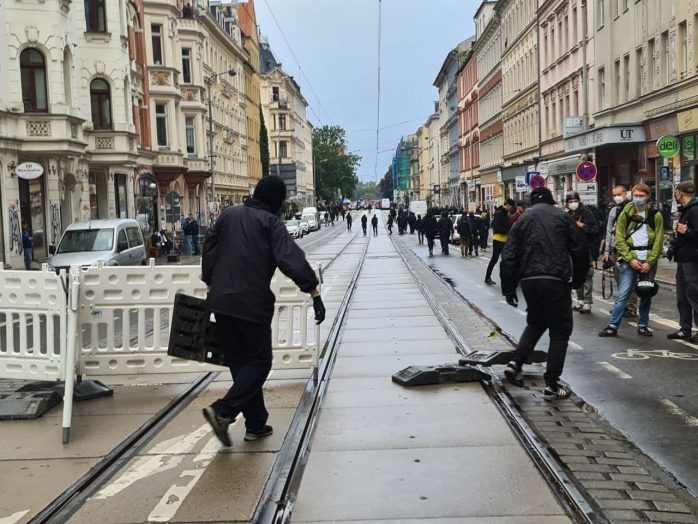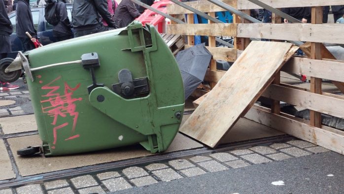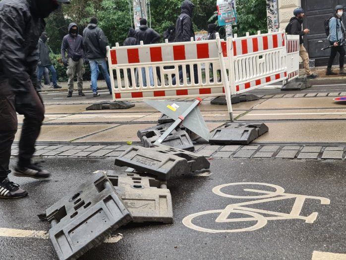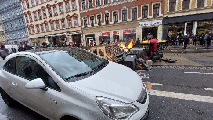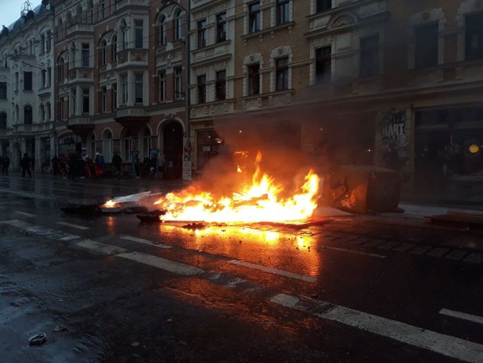 Während die letzten Redebeiträge bei der Schlusskundgebung verlesen werden und diejenigen zuhören, die wegen des Protestes nach oder aus Leipzig an den Johannisplatz und nun ans Connewitzer Kreuz kamen, entwickelt sich eine Szenerie, der die Polizei nicht mehr lange zuschauen wird. Vermehrt werden Müllcontainer auf die Straße geschoben, verschiedenste Materialien bereit und in den Weg gelegt, kleine Barrikaden errichtet.