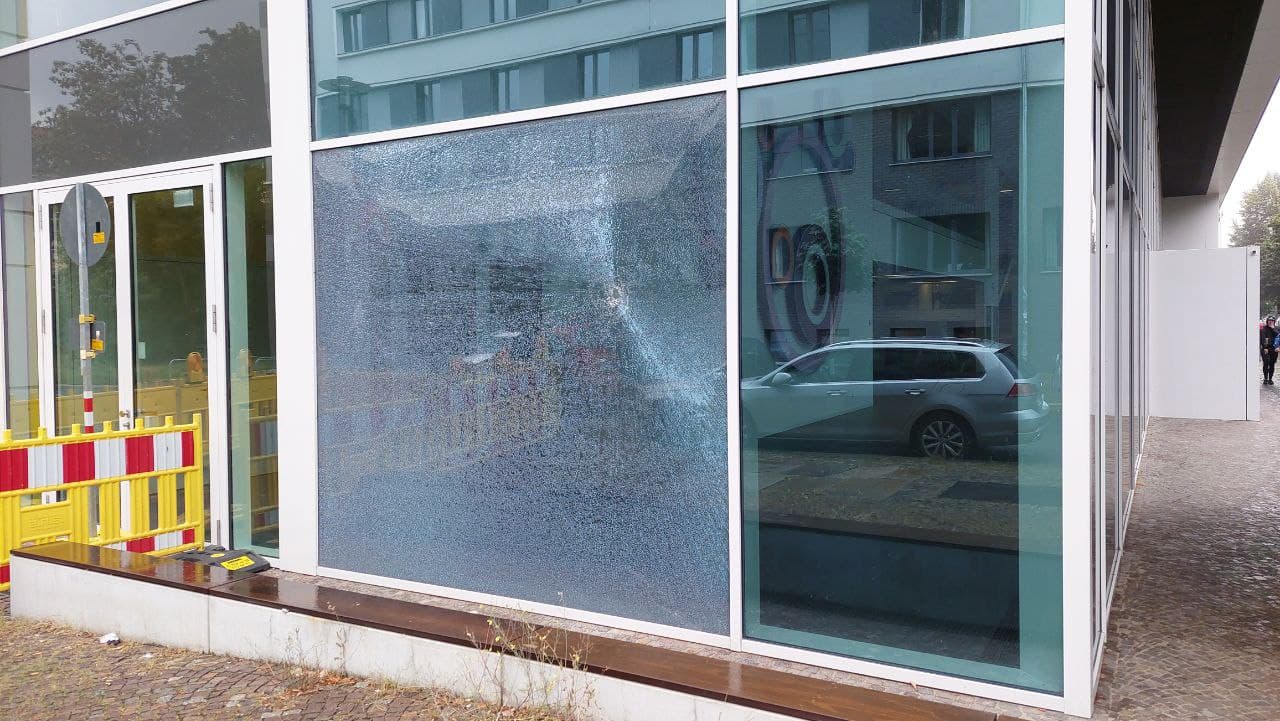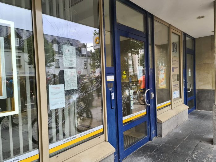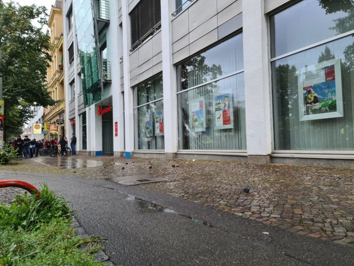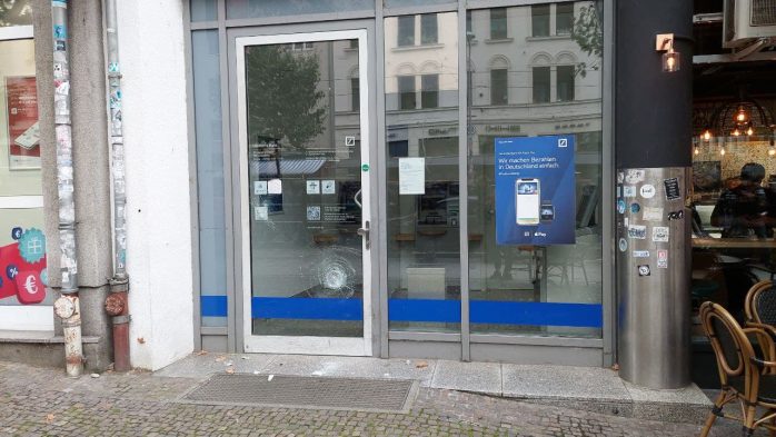Die Mehrheit ist gekommen, um „kraftvoll“, wie es hieß, gegen staatliche Repressionen und rechte Netzwerke in Polizei und Justiz sowie für eine Beendigung des 129er-Verfahrens gegen Lina E. zu protestieren. Doch in einem Teil der Demo scheint es teilweise um etwas anderes zu gehen. Eine Bankfiliale an der KarLi zeigt erste Spuren der vorübergezogenen Versammlung.