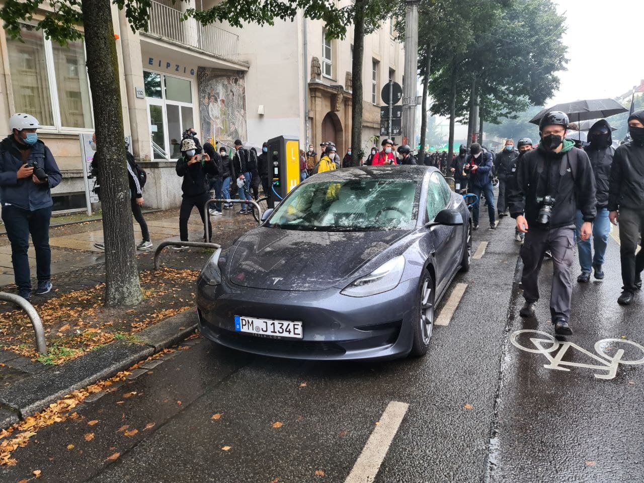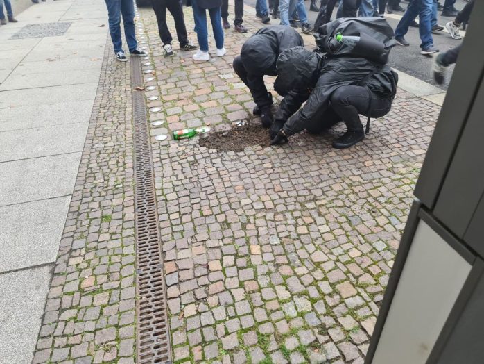 Je weiter der Demonstrationszug Richtung Süden kommt, umso häufiger geschehen links und rechts des Zuges durch kleine Gruppen Straftaten. Während der Zug auf der Karl-Liebknecht-Straße entlang mittlerweile auf Höhe Gustav-Freytag-Straße angelangt ist, hat es aus Seitenstraßen wiederholt Stein- und Flaschenwürfe gegeben.