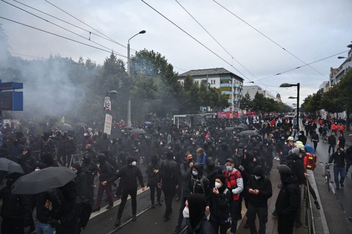 Massiver jedoch sind die Beschreibungen dessen, was auch die LZ-Journalisten vor Ort erlebten. So kam es „entlang der Aufzugsstrecke in der Karl-Liebknecht-Straße zu Bewürfen von Bankgebäuden, Fahrzeugen sowie Einsatzkräften und Einsatzfahrzeugen.“