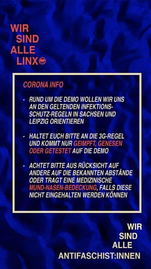 Aktuell findet eine Zwischenkundgebung vor der Polizeidirektion an der Dimitroffstraße statt. Es geht um Lina E., die bisherige Berichterstattung in den konservativen bis rechten Medien darüber und die begleitende Bedrohung durch Faschisten. Hier ist man der Meinung „Konsequenter Antifaschismus ist legitim und notwendig“, so in einem Redebeitrag.