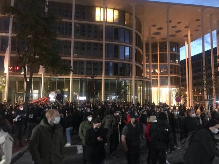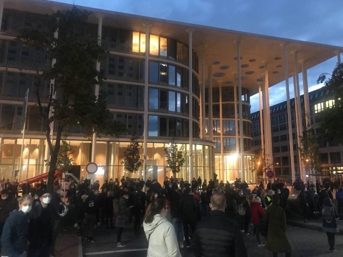 Wie viele Menschen es genau sind, die sich spontan hier einfinden, ist noch nicht genau zu sagen. Mindestens 500, die innerhalb der letzten zwei Stunden mobilisiert wurden und es werden mehr. Soeben wurde die Versammlungsfläche erweitert.