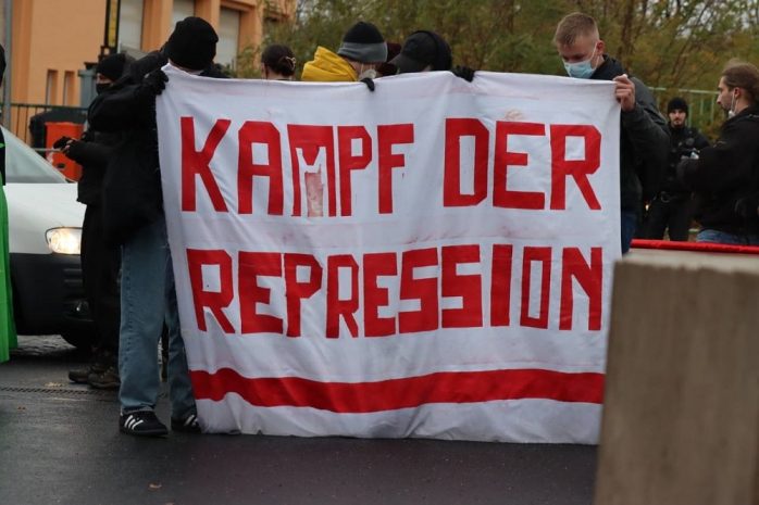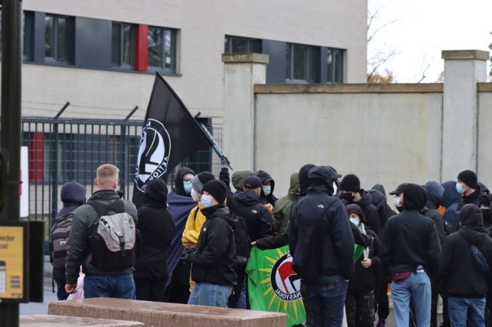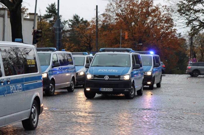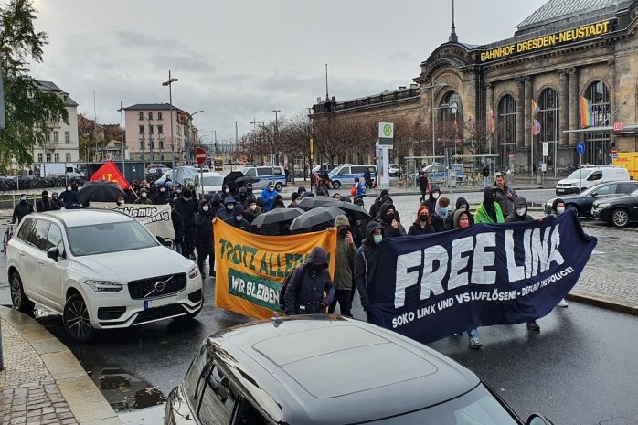 Das war auch das Ziel eines solidarischen Demonstrationszuges, der am heutigen Nachmittag vom Bahnhof Neustadt über den Bischofsplatz bis zum OLG führte. Dort, wo zeitgleich der 13. Prozesstag gegen die Angeklagten stattfand. Knapp 50 Menschen nahmen an der Kundgebung teil, die vom Solidaritätsbündnis „Antifa Ost“ angemeldet wurde. Massive Polizeipräsenz war ebenfalls vor Ort. Die Veranstalter/-innen kritisieren die Inhaftierung von Lina E. scharf. E. sei eine ausreichende medizinische Versorgung erschwert worden. Die 27-Jährige leide an einer rheumatischen Arthritis und konnte erst nach sechs Monaten einen dringenden Kliniktermin wahrnehmen. Auch Schikanen beklagt das Soli-Bündnis: „Zwei Wochen lang brannte das Licht in ihrer Zelle ununterbrochen, auch nachts wurden alle zwei Stunden ihre Vitalzeichen überprüft, 24 Stunden am Tag stand sie unter Beobachtung.“