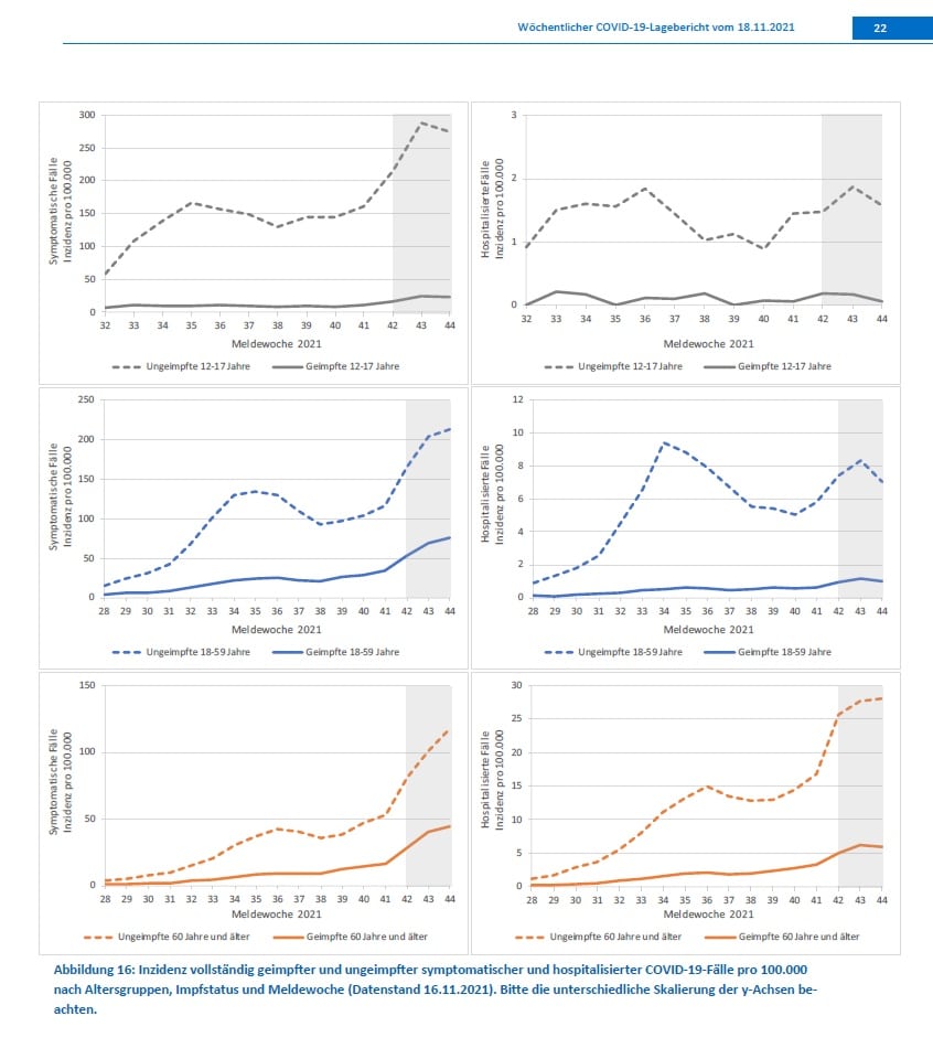 Eine Behauptung, die mit den Daten des RKI am 18.11.2021 durch die Hospitalisierungsangaben in allen anderen Altersstufen widerlegt wird (siehe Grafik: „Warum Impfen?“). Auch deshalb wird das Risiko eines ungeimpften Erwachsenen an COVID-19 zu versterben mit bis zu 30-fach über dem angegeben, welches ein gegen COVID-19 geimpfter Erwachsener hat.