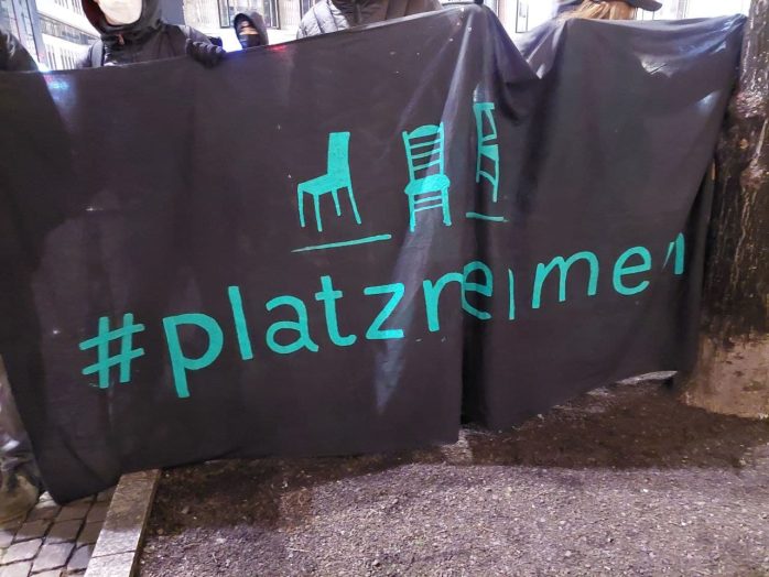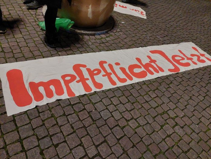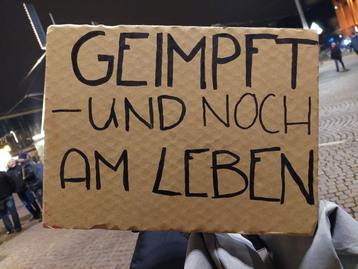 Vor Ort wird die Situation langsam etwas lauter. Der Gegenprotest, welcher seine Versammlungen anmeldetet, mit Mund-Nasen-Schutz herumläuft und Abstände wie auch die Begrenzungen von 10 Personen pro Versammlung einhalten muss, skandiert „Geht sterben“ und fordert auf Plakaten die Impfpflicht gegen COVID-19 ein (siehe Video im Anschluss).