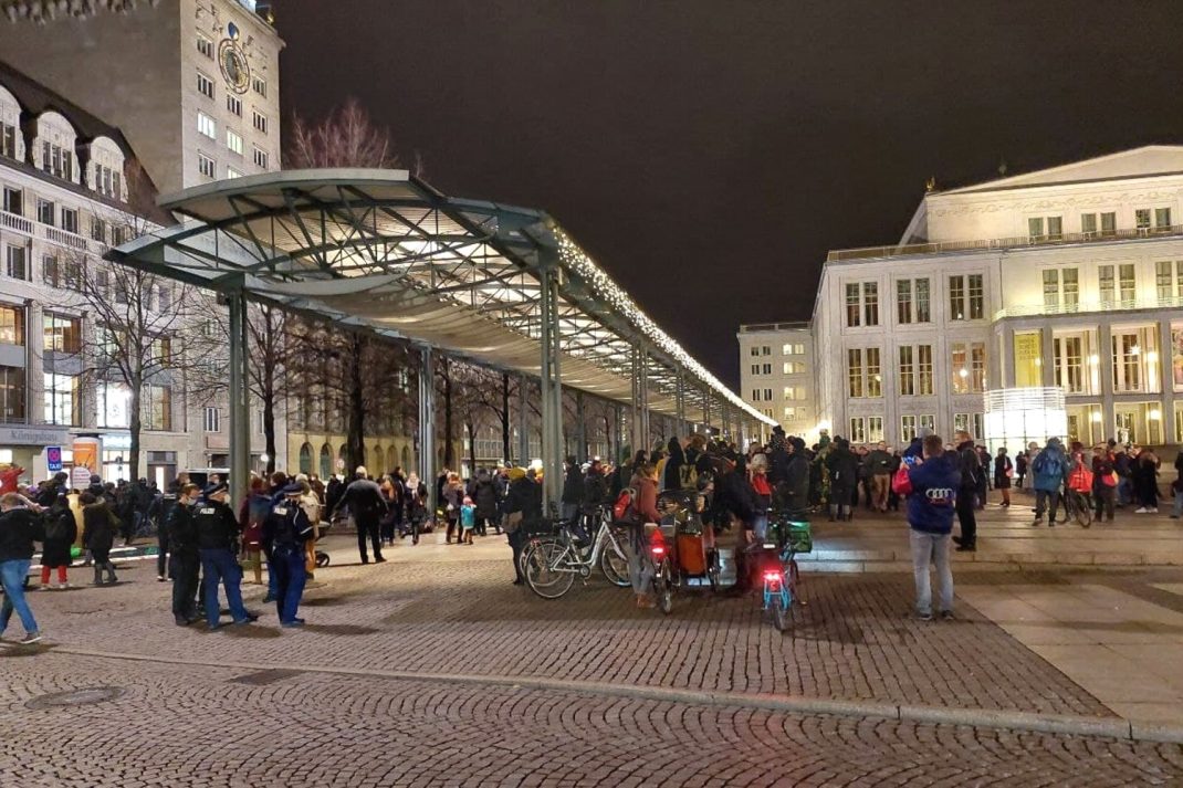 Gelernt haben die Behörden daraus aber nicht oder eben etwas anderes, als gedacht. Es seien zu wenige Beamte da, meint nun die Polizei vor Ort auf dem Augustusplatz, um dem Versammlungsrecht entweder Geltung zu verschaffen, indem sich ein Versammlungsanmelder findet oder eben die Ansammlung aufgelöst wird. Die Durchsagen der Beamten verhallen ohne Reaktion, vereinzelt ist ein „Halts Maul“ zu hören.
