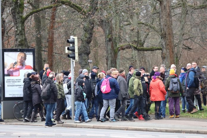 Doch längst hat sich herauskristallisiert, dass jene, die sich da erneut um 15 Uhr zum gemeinsamen „Spaziergang“ trafen, den Akt der unangemeldeten Demonstration ohne Versammlungsleitung als Zweck, Trotz und Widerstandshandlung selbst sehen. Gegenüber und um sie herum meist junge Menschen mit schwarzer Kleidung, Masken und Protest gegen sie – die meist eher über 40, 50-jährigen Demoteilnehmer/-innen, Männer und Frauen, unter denen es wichtig ist, ungeimpft zu sein.