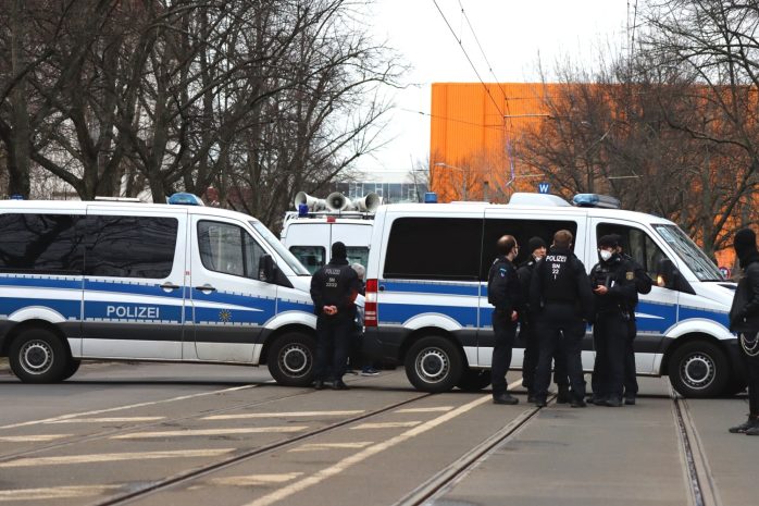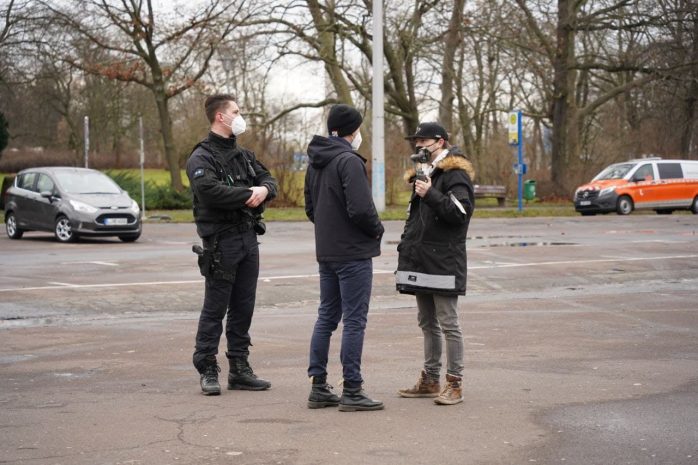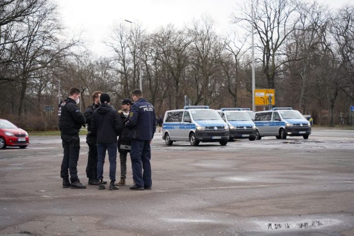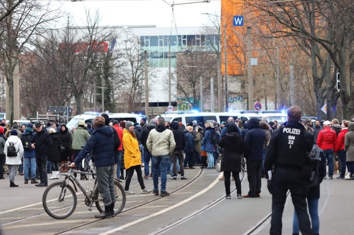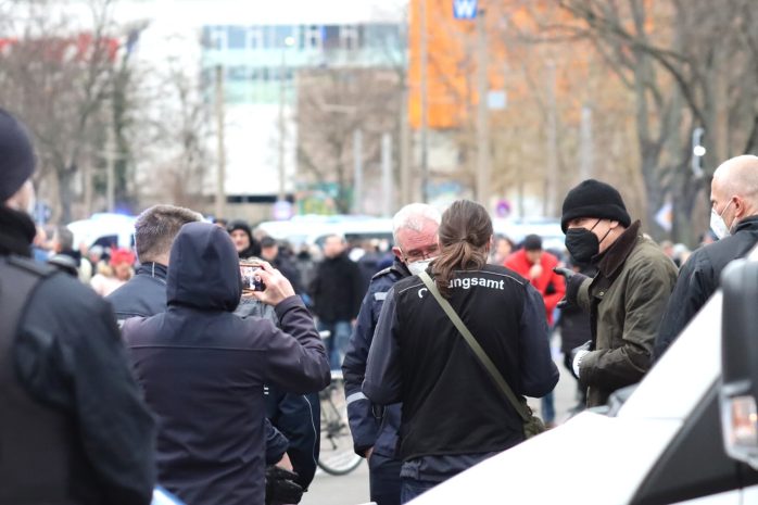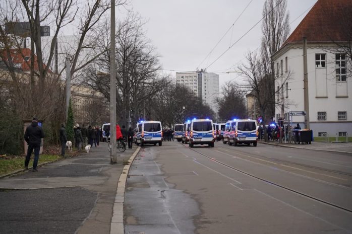 Als sich der Versammlungszug kurz nach 15 Uhr vom Wilhelm-Külz-Park aus in Bewegung setzen will, ist dieses Mal die Menge und Präsenz der Polizeibeamten eine andere als noch vor sieben Tagen. Da hatten rund 300 Demonstrant/-innen aus der Impfgegner-, „Querdenker“- und Sehrlautdenker-Fraktion noch eine längere Runde ohne Versammlungsleiter drehen können – dieses Mal nicht.