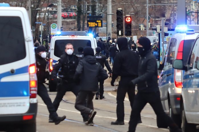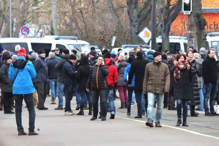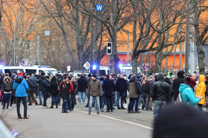 Die Beamten sind seit diesem Zeitpunkt zudem damit befasst, umherrennende Gegendemonstranten von „Leipzig nimmt Platz“ im Griff zu behalten – die Gruppen werden bis zum Ende hin strikt getrennt bleiben.