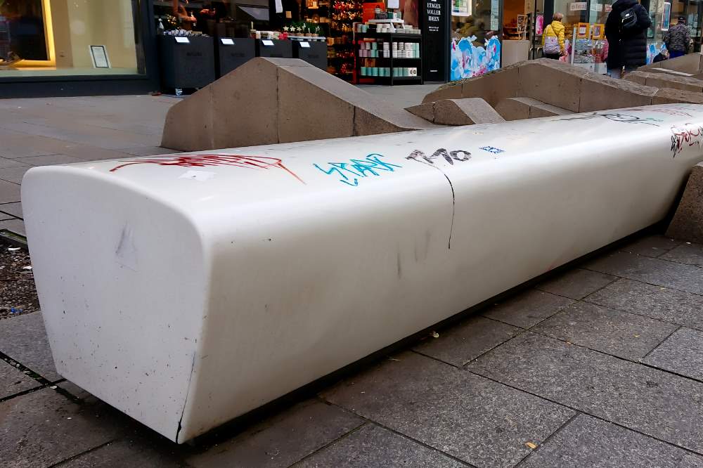 Ähnlich unbequeme Sitzgelegenheiten findet man auch in der Grimmaischen Straße. Dort, zwischen den Wasserspielen, sind es allerdings nicht die Armlehnen, sondern die Sitzflächen selbst, die die Bänke so ungemütlich machen. Sie sind abgerundet, sodass man runterrutscht, wenn man es sich allzu bequem macht.