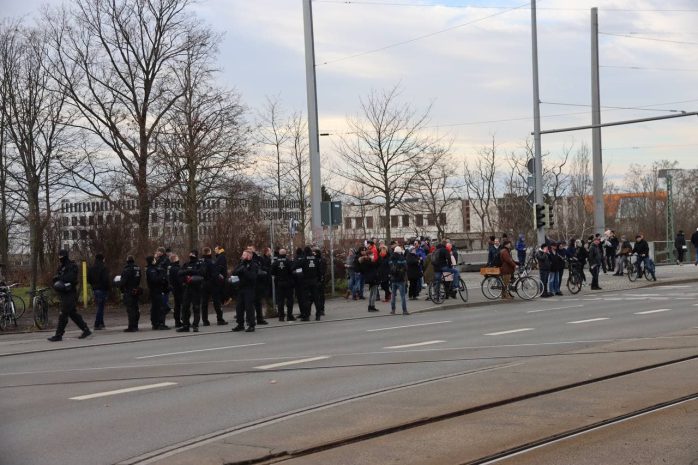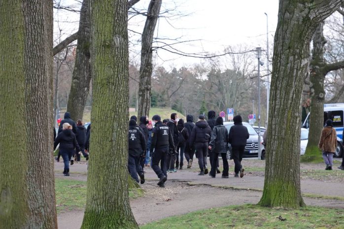 Irgendwas hat sich schon ein wenig totgelaufen. Wie viele der „Spaziergänger“ heute zum angeblichen „Schlüsselsuchen“ im Külzpark umherstrichen, nachdem ihnen die Demonstration an der Polizeiabsperrung und mangels Anmeldung nicht gelang, ist nicht genau zu sagen. Doch so ziemlich jeder vor Ort stellte weniger von ihnen fest, weshalb 150 bis 200 Menschen schon stimmen wird.