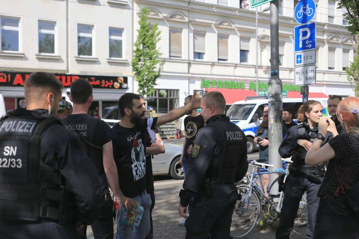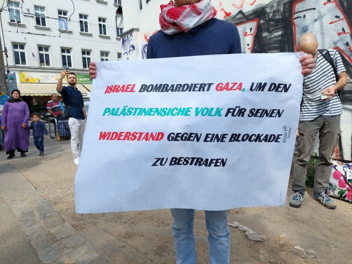 Protest gegen die Demonstration gab es dennoch. Kurz nach einer Zwischenkundgebung am Rabet stellten sich zwei Personen mit Israel-Fahnen an den Rand. Aus dem Aufzug heraus drängten mehrere Personen in die Richtung der kleinen Gegenkundgebung; Ordner hielten diese jedoch zurück. Lediglich ein Demoteilnehmer stellte sich in die Nähe der Personen mit Israel-Fahnen, drohte diesen Gewalt an und bezeichnete sie als „Kindermörder“.