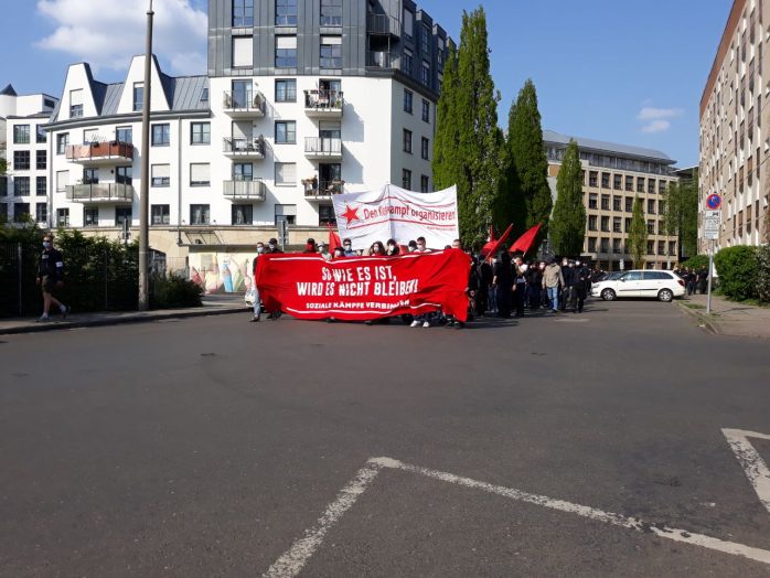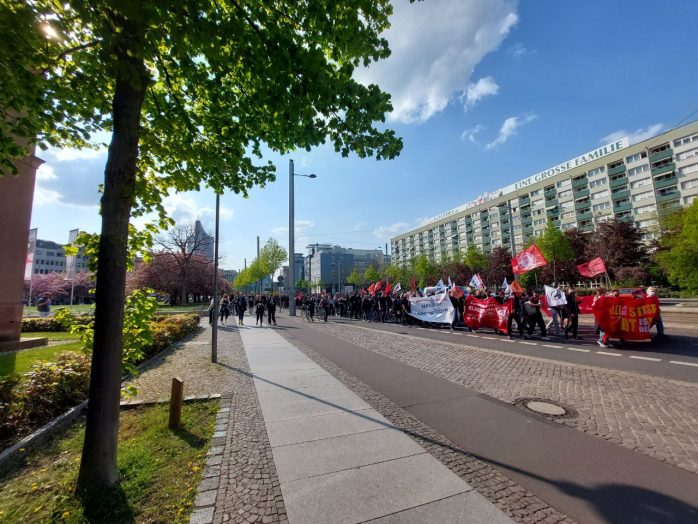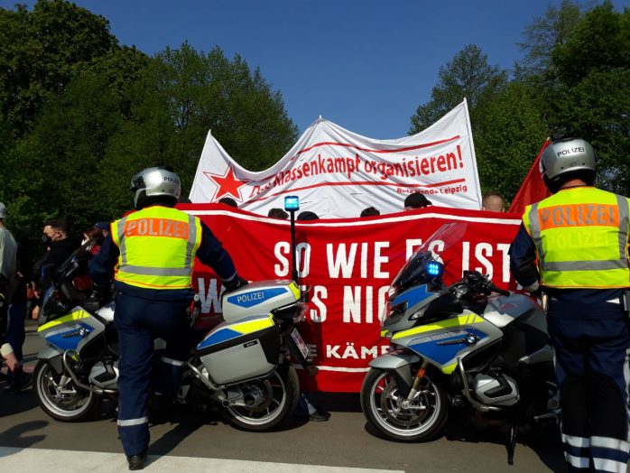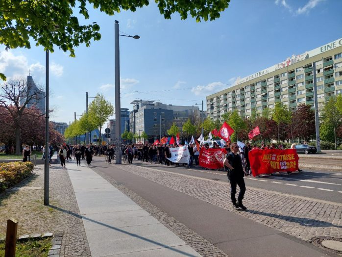 15 bis 18 Uhr, Anzeigender: Initiative „Soziale Kämpfe“, Aufzug unter dem Motto „1. Mai: Kämpfe verbinden! Wir zahlen nicht für eure Krise, soziale Sicherheit statt Aufrüstung!“ mit ca. 250 TeilnehmerInnen auf folgender Route: Augustusplatz, Gewandhausseite (Sammlung & Auftakt) – Augustusplatz Mittelfahrbahn – Goethestraße – Brühl – Hainstraße – Markt – Thomasgasse – Thomaskirchhof – Dittrichring (Außenring) – Otto-Schill-Straße – Dorotheenplatz (Zwischenkundgebung) – Kolonnadenstraße – Max-Beckmann-Straße – Reichelstraße – Friedrich-Ebert-Straße – Karl-Tauchnitz-Straße – Herzliyaplatz – Anton-Bruckner-Allee, Sachsenbrücke (Abschluss & Beendigung).