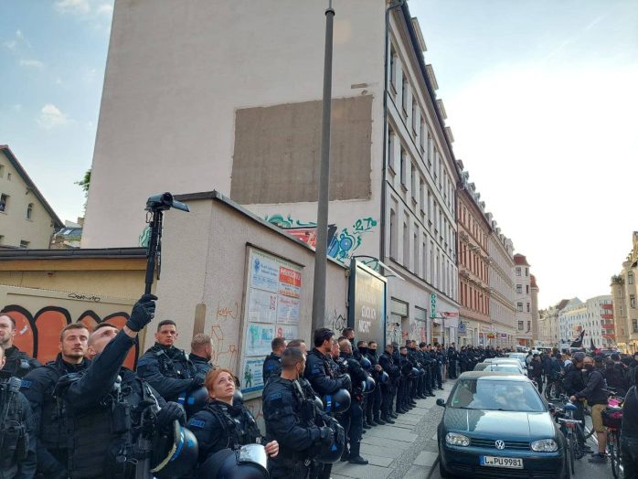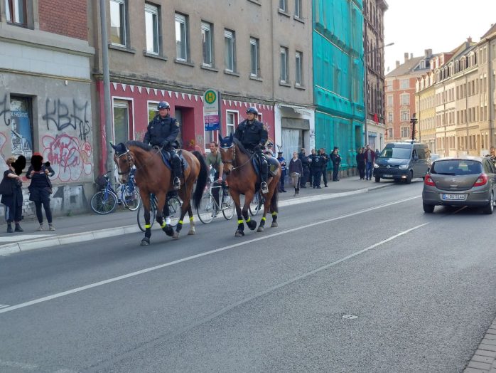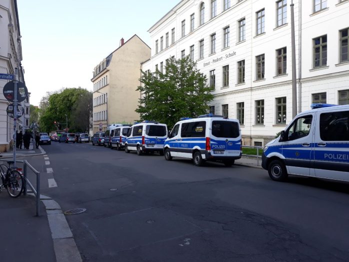Sicherlich hat es auch damit zu tun, dass die anderen Demonstrationen bereits vorbei und die entsprechenden Polizeikräfte wieder frei sind. Aber die Dichte an Beamten rings um die letzte Demonstration des Tages ist schon beachtlich, flankiert von einem deutlich gewachsenen Medienaufgebot rings um die Zweinaundorfer Straße.