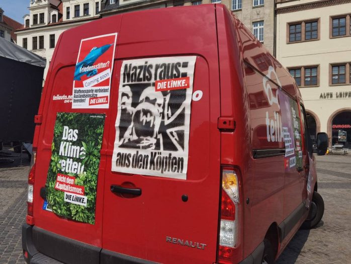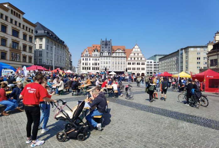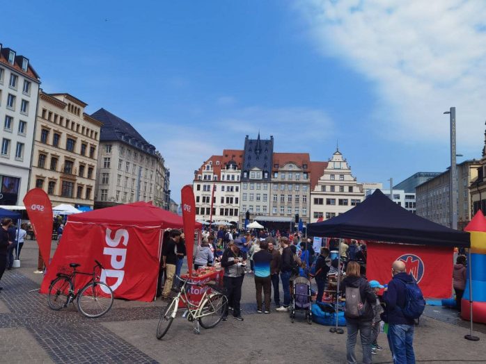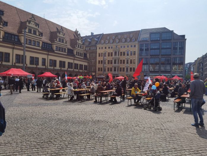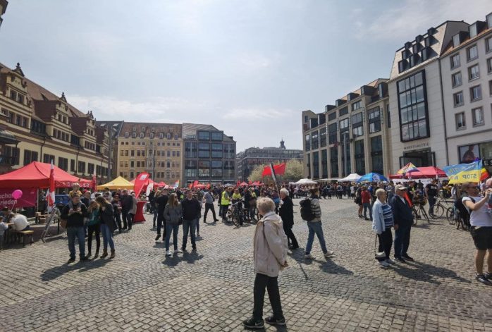 Den Auftakt gestaltete die DGB-Kundgebung mit den üblichen Ständen von Gewerkschaften über Parteien, Initiativen und Verbänden auf dem Leipziger Marktplatz, welchen bislang rund 800 Menschen besuchten. Darunter auch der eintreffende Demonstrationszug der Linkspartei, welcher vor allem die Erhöhung der Militärausgaben in Deutschland im Auge hatte.