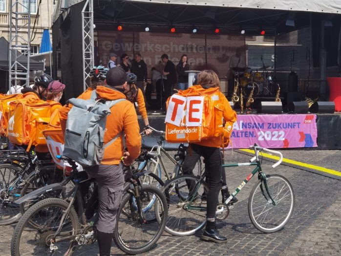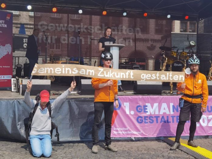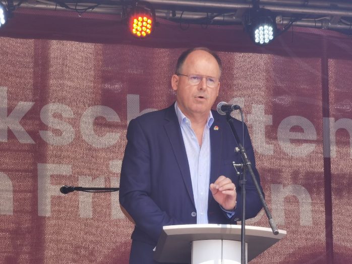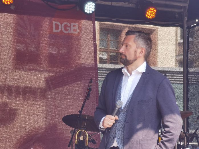 Neu in diesem Jahr waren die sogenannten „Kriegslasten“, deren Schulterung DGB-Bundesvorstand Stefan Körzell in seinem Redebeitrag nicht wieder bei den Lohnempfängern im Land sah.