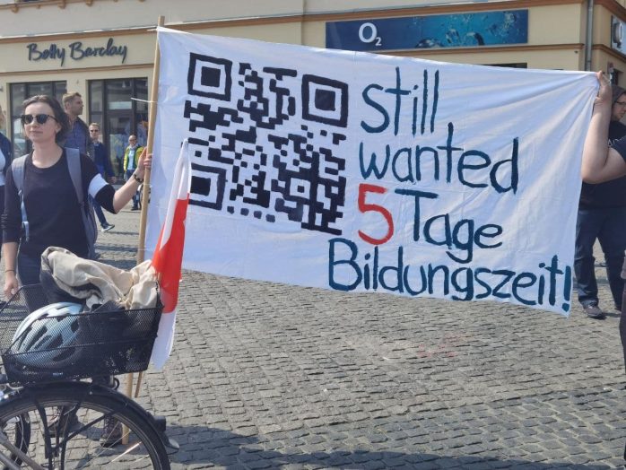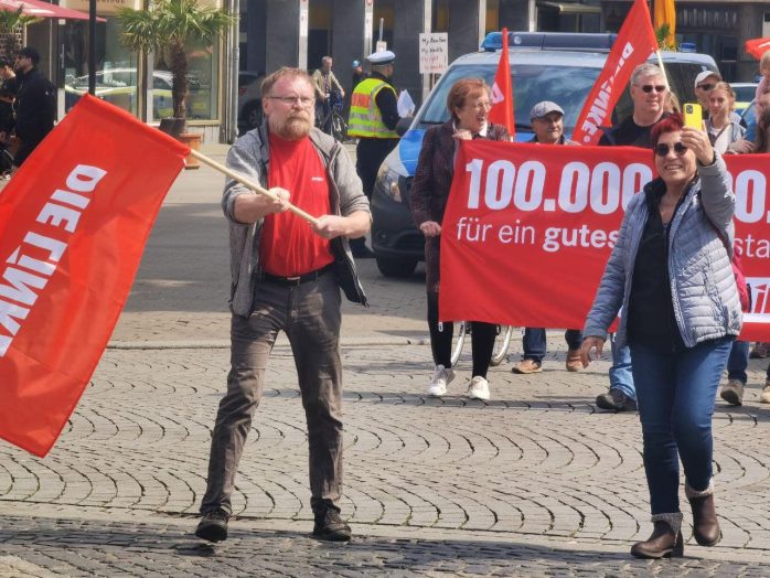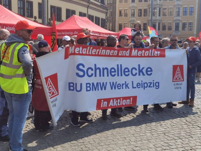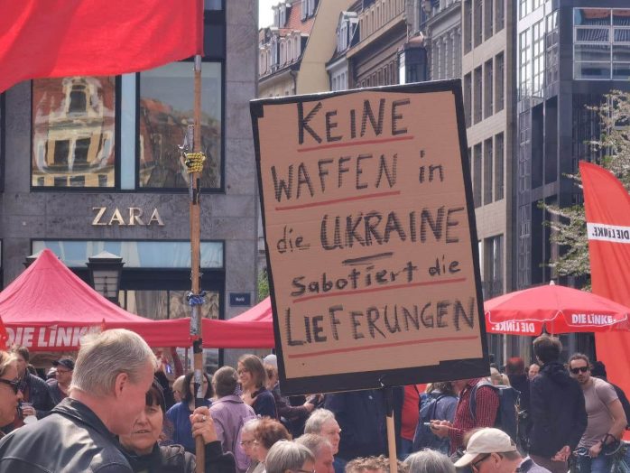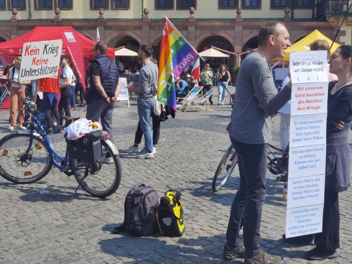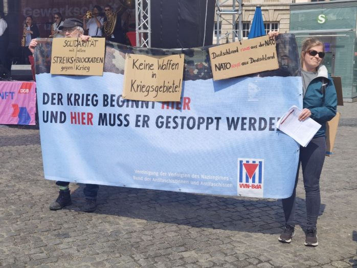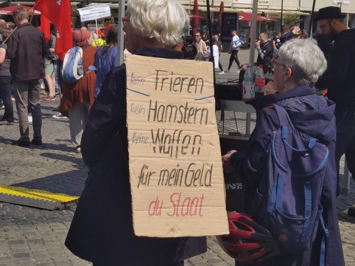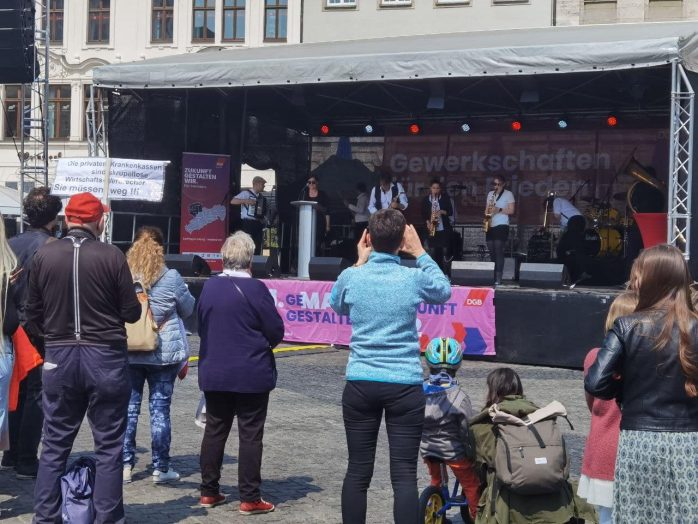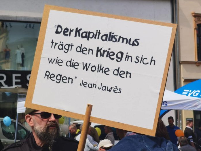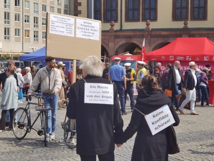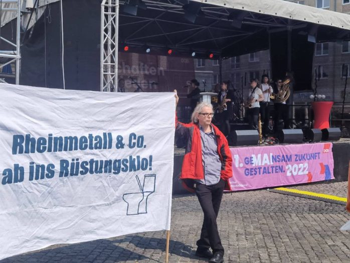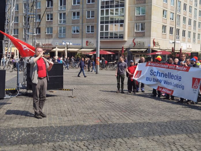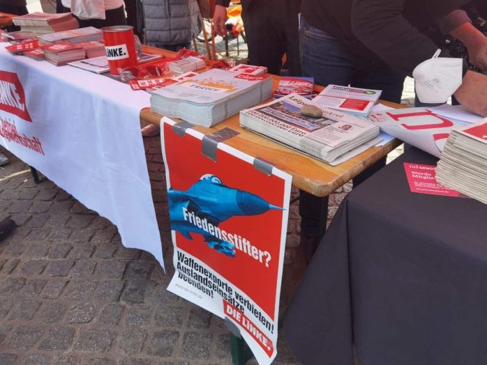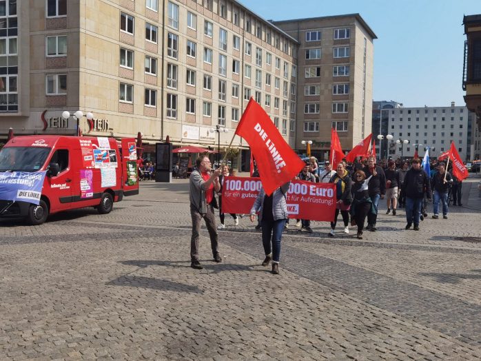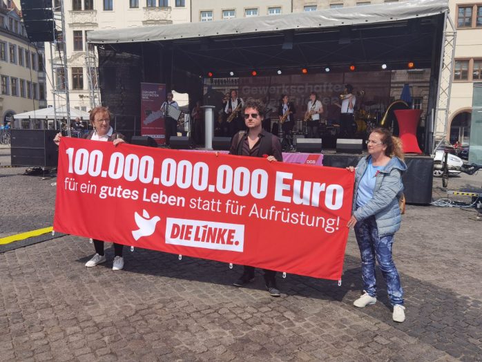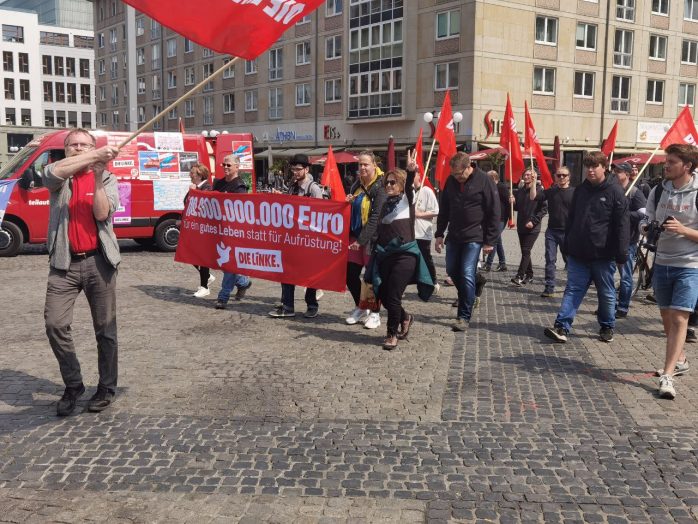 „Wer ein Sondervermögen schaffen kann von 100 Milliarden für die Bundeswehr, der sollte sich mal Gedanken machen, ein Sondervermögen zu schaffen für Bildung, Pflege und gute Sozialleistungen“, so Körzell zu einer Utopie, die offenbar trotz SPD-geführter Regierung und der Einführung eines neuen Mindestlohns von nunmehr 12 Euro eine zu bleiben droht. Auch die vor der Bühne demonstrierende Leipziger Linke forderte den 100 Milliarden-Fond „für ein gutes Leben statt für Aufrüstung“.
