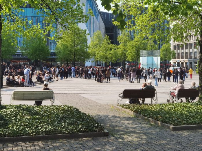 Gegen 15:45 Uhr ging es los mit der Demo vom Südplatz aus. Statt der angemeldeten 100 Teilnehmer/-innen dürfte sich die Zahl eher um die 250 bis 300 bewegen. Gleichzeitig ist die zweite Demonstration vom Augustusplatz kommend im Kolonnadenviertel auf rund 500 Menschen angestiegen.
