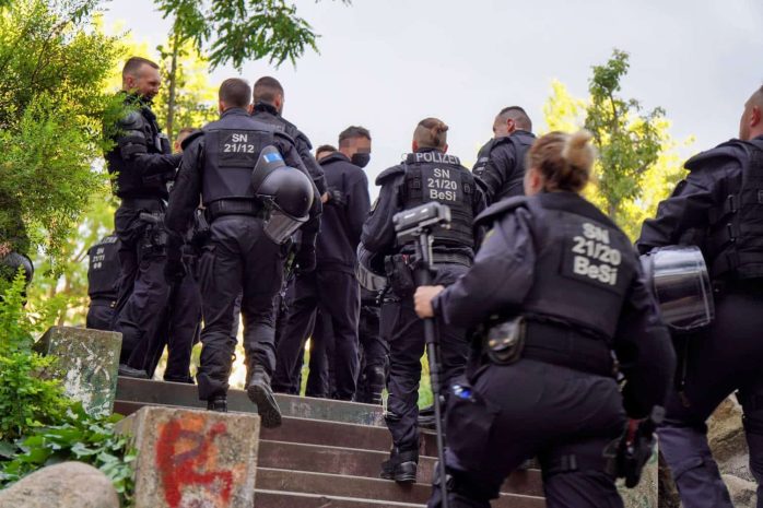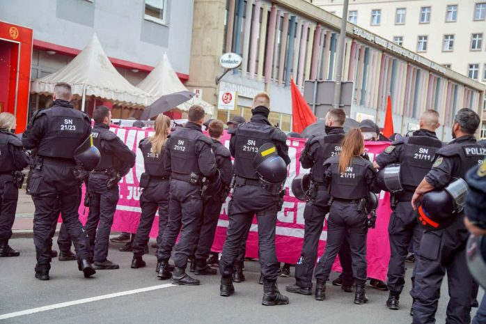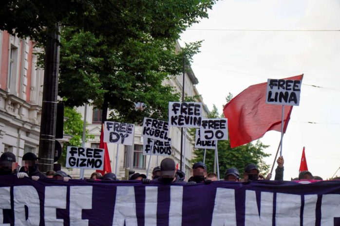 Auf dem weiteren Weg bis zum Herderpark in Connewitz blieb die Stimmung angespannt. Die Polizei filmte mehrmals den Aufzug, einige Teilnehmer/-innen wiederum riefen dazu auf, Nazis und Polizist/-innen mit „Hammer, Sichel und Gewehr“ zu bekämpfen. Thematisch drehten sich die Parolen auch um Gentrifizierung und Antikapitalismus.