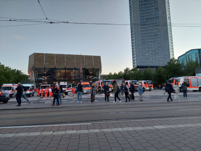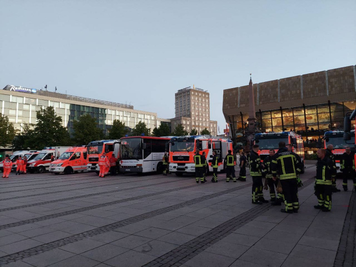 Die ersten Feuerwehrwagen haben den Augustusplatz Richtung Leuschnerplatz verlassen, der Bahnverkehr in diesem Gebiet ist stillgelegt.