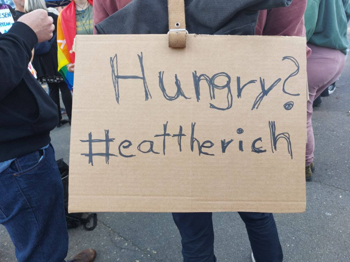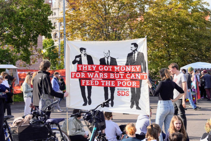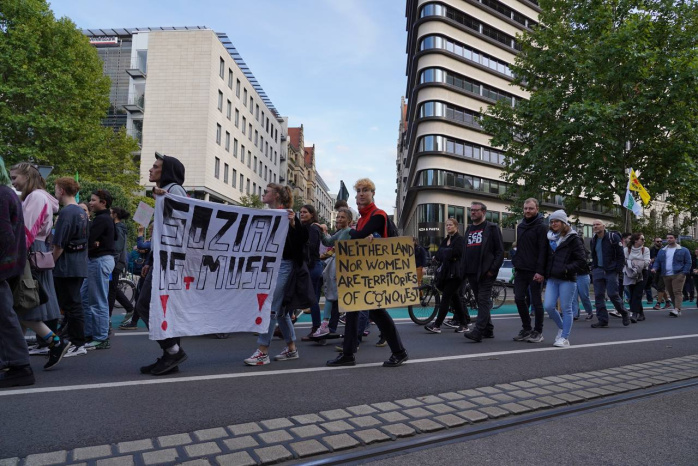Kurz vor offiziellem Demoschluss ist die Stimmung locker und entspannt. Auch der „Antikapitalistische Block“ hat sich nach Mitteilung unserer Kollegen vor Ort mit Wiederankunft auf dem Leuschner aufgelöst. Ebenso scheint die Polizei, die eben noch mit Blaulicht unterwegs war, jetzt den Rückzug anzutreten. Musik schallt aus Boxen, es sind noch ein paar Redebeiträge geplant.