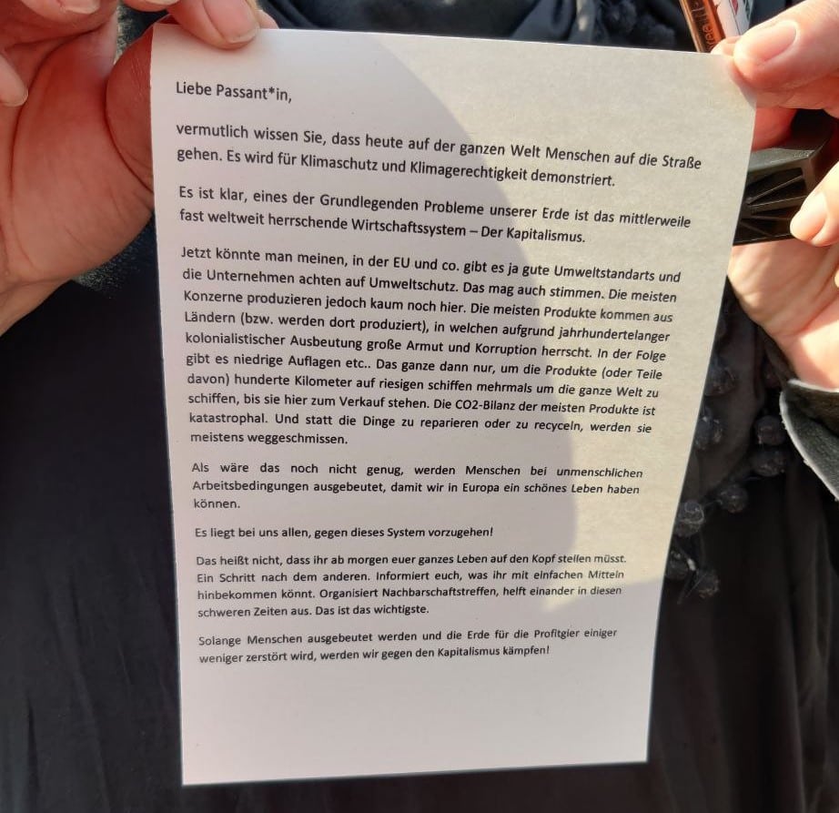 Unter dem Motto „Gegen Staat und Kapital – Klimaschutz bleibt radikal“ hat auch der „Antikapitalistische Block“ einen Protestzug angekĂĽndigt. Nach eigener Aussage nimmt er mit etwa 250 Personen am Klimastreik teil.
