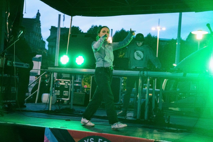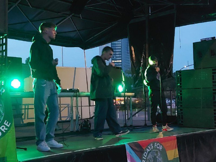 Die Demo befindet sich im Zeitverzug – das Programm wĂĽrde noch etwa eine Stunde umfassen, inklusive Redebeiträgen und zwei Musik-Acts. Eine Verlängerung wurde offenbar nicht gewährt, 19:35 Uhr soll jetzt angeblich das Ende sein.
