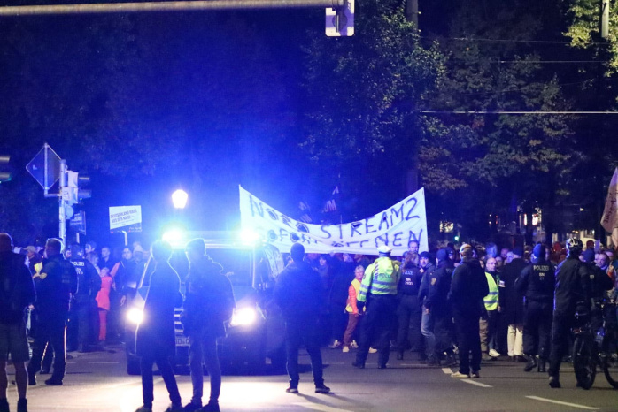 Als Annette H. den Demozug an diesem 26. September 2022 gegen 19:20 Uhr auffordert, „wir wollen jetzt loslaufen“, hat sie erst einmal damit zu tun, eine Gruppe Männer von der Zugspitze wegzudirigieren. Das mittlerweile überholte Banner „Nordstream 2 sofort öffnen“ soll nach vorn, nicht die sich selbstbewusst aufstellende Gruppe um Lucien W. und ihr „Den Wahnsinn stoppen“-Transparent.