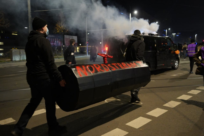 Während man hier also schon beinahe etwas folkloristisch Frieden fordert, war kurz nach dem Gang auf den Ring ein Künstlerkollektiv rings um „Annette Hoffmann“ aktiv und öffnete gegen 19:30 Uhr symbolisch „Nordstream 2“.